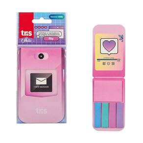 O kit de notas autoadesivas flip é inspirado no celular mais icônico da época e possui 1 bloco de notinhas e 4 blocos de marcadores de páginas.