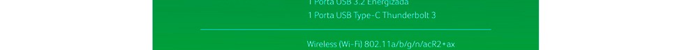 -Wireless e Rede: Wireless (Wi-Fi): 802.11a/b/g/n/acR2+ax Frequência: até 5GHz Ântena: 2x2 MU-MIMO Suporta Bluetooth® 5.0 Interface Wi-Fi CNVi