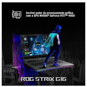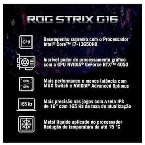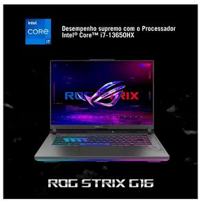 Características Processador Intel CoreT i7 - 13650HX - 13 Geração Velocidade do Processador: 2,6 GHz Cache: 24 MB Sistema Operacional Windows 11 Home Sistema Operacional Windows pré-instalado no produto, não acompanha mídia Memória 16GB Tipo da Memória: DDR5 Suporta até: 32GB, sendo 16GB + 16GB slot SODIMM HD 512GB SSD Tela Tipo de Tela: LED backlight, IPS level, 165Hz, anti-glare, 16:10 Tamanho da Tela: 16" Resolução da Tela: 1920x1200 Placa de Vídeo NVIDIA RTX4050 Rede Wi-Fi 6E Conexão Wireless (802.11ax) (Dual Band) 2x2 Bluetooth Sim, versão 5,2 Áudio 2 alto-falantes com tecnologia Smart Amplifier Arranjo de microfones AI noise-canceling technology Dolby Atmos Certificação Hi-Res Suporta Microsoft Cortana near field/Far field Portas Frontais/Laterais/Traseiras 1x RJ45 LAN port 1x ThunderboltT 4 support DisplayPortT 1x USB 3.2 Gen 2 Type-C support DisplayPortT / power delivery / G-SYNC 2x USB 3.2 Gen 2 Type-A 1x HDMI 2.1 FRL 1x 3.5mm Combo Audio Jack Teclado Chiclet / ABNT2 Mouse Touchpad Bateria 4 Cells / 8100 mAh Cor Eclipse Gray EAN 7898573299920 Especificações Técnicas Modelo: G614JU-N3380W Garantia: 12 meses Dimensões e Peso Dimensões do produto sem embalagem (AxLxP): 30,4x354x264 mm Dimensões do produto com embalagem (AxLxP): 10,6x420x335 mm Peso do produto sem embalagem: 2,5 Kg Peso do produto com embalagem: 6 Kg Itens Inclusos 01 Notebook 01 Carregador Manual