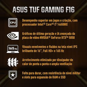 O notebook gamer TUF Gaming F16 é o equilíbrio perfeito entre potência e portabilidade. Elegante e robusto, embarca processador Intel Core i7 14650HX e placa de vídeo NVIDIA GeForce RTX 5050 para alto desempenho em jogos e criação, além da tela brilhante de 16 polegadas. O arrefecimento fica por conta do novo dissipador de calor de ponta a ponta, que mantém a performance estável mesmo em alta demanda. Por fim, a resistência de nível militar, assim como os slots para expansão de RAM e SSD, asseguram a durabilidade da máquina por anos.