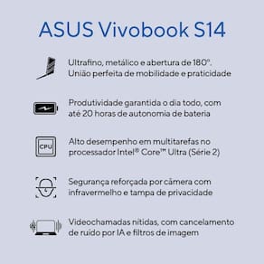 O ASUS Vivobook S14 une estilo, potência e segurança qualidades essenciais para quem busca o melhor notebook para trabalho, estudo ou lazer. O design metálico ultrafino com abertura de 180 garante mobilidade e praticidade, enquanto a bateria de longa duração permite um dia inteiro de produtividade. Equipado com processador Intel Core Ultra (Série 2), que alcança alto desempenho em multitarefas, o dispositivo ainda tem câmera com infravermelho e tampa de privacidade para reforçar a segurança. Por fim, tecnologias de IA tornam videochamadas mais nítidas via cancelamento de ruído e filtros de imagem.