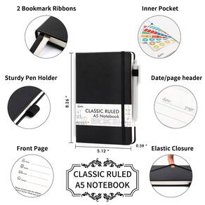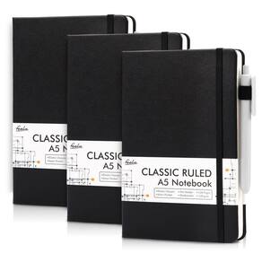 Pacote com 3 cadernos, diários a granel com 3 canetas pretas, caderno de capa dura feela A5, conjunto clássico pautado com suporte de caneta para anotações, 120 g/m2, 13 x 21 cm, preto - Feela Pacote com 3 cadernos clássicos pautados contém 3 cadernos clássicos pretos pautados com capa resistente e 3 canetas pretas retráteis. Cada um dos cadernos mede 21 x 13 cm, o que é perfeito para carregar e facilmente segurado por meninas e meninos. Estas canetas pretas fofas são personalizadas para serem colocadas no porta-canetas, o que é muito conveniente. - Estes cadernos pautados clássicos são todos em branco por dentro com 128 páginas pautadas (64 folhas), o que seria conveniente para o uso diário. O diário de capa dura tem uma capa de couro sintético resistente à água, cantos arredondados e marcadores de livro, que é projetado para ficar deitado e aberto. Há uma coluna de "data/página" na parte superior de cada página. Você pode usá-lo como um lembrete para lembrar aquelas datas importantes e encontrar a página que deseja em um tempo muito curto. - Há 3 canetas pretas retráteis na caixa. Você pode usá-lo assim que receber. Estas canetas são perfeitas para serem colocadas no porta-canetas do caderno pautado clássico. O tubo grande tem a capacidade de restaurar mais tinta, o que os torna duradouros. Secagem rápida pode evitar manchas e manchas. - Feela O conjunto de 3 cadernos pautados clássicos é perfeito para muitas pessoas e muitas ocasiões. Alunos do ensino fundamental e clássico podem usá-lo para escrever notas ou fazer trabalhos de casa. Os passageiros podem usá-lo para organizar seu horário de trabalho diário e anotar marcos importantes. Sua menina ou menino pode usá-lo como o começo de rabiscar e escrever. - Desempenho e satisfação: fornecemos não apenas nossos produtos de alta qualidade, mas também nosso serviço de resposta rápida.