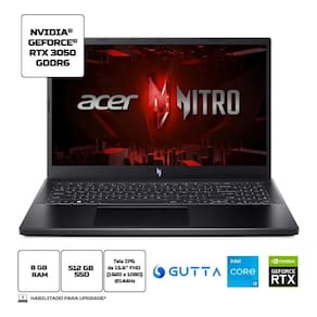 Notebook Acer Nitro V Intel Core i5-13420H de 13 geração 15.6 FHD GeForce RTX3050 512GB SSD 8GB RAM Linux Gutta ( ANV15-51-57WS ): Processador Intel Core i5-13420H de 13 Geração série H (High Edition) com 8 núcleos;Tela 15.6, IPS com resolução Full HD, taxa de atualização 144Hz;GPU Nvidia GeForce RTX 3050 com 6GB de memória dedicada GDDR6 com eficiência total(TGP) de até 80W;Eficiência térmica de 2 ventoinhas com modos variados de rotação;Memória RAM DDR5;512 GB de armazenamento em SSD NVMe;Sistema Operacional Linux Gutta;Tecnologia DTS X: Ultra Áudio;Teclado retroiluminado na cor branca com ajuste de intensidade;Tecla de atalho Nitro Sense;Habilitado para upgrades.