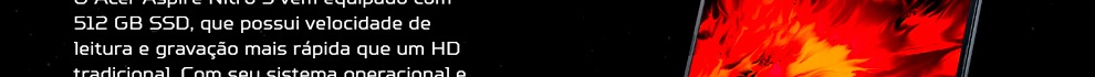 O Acer Nitro 5 vem equipado com 512GB SSD. É muito espaço para armazenar todos os seus arquivos e velocidade de leitura e gravação superior a um HD tradicional. Com o SSD, todos os seus jogos abrirão em poucos segundos.