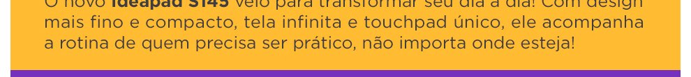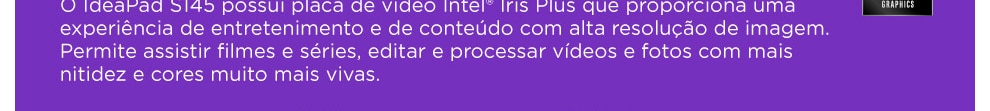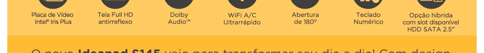 Lenovo Ideapad S145: Design sofisticado leve e compacto, possui tela Full HD antirreflexo de 15.6" para mais conforto visual e definição de imagem. Um notebook perfeito para produtividade e entretenimento com WiFi AC ultrarrápido e teclado numérico. Conta com abertura de tela de 180 graus para mais flexibilidade e facilidade de uso. Possibilidade de utilizar o armazenamento de forma híbrida e ganhar muito mais agilidade e produtividade no seu dia a dia. Com o slot disponível, você tem a opção de adicionar um HDD SATA 2,5'', para armazenar muito mais informações. Nitidez e alta qualidade de som com certificação Dolby Audio.