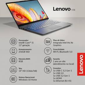O notebook Lenovo V14 possui grande desempenho, design compacto com tela de 14"", foi projetado para aprimorar sua experiência de trabalho, seja no escritório ou em casa. Aproveite ao máximo os processadores Intel Core de 11 geração para executar multitarefas com eficiência, enquanto os recursos de segurança mantêm você e seu trabalho protegidos.