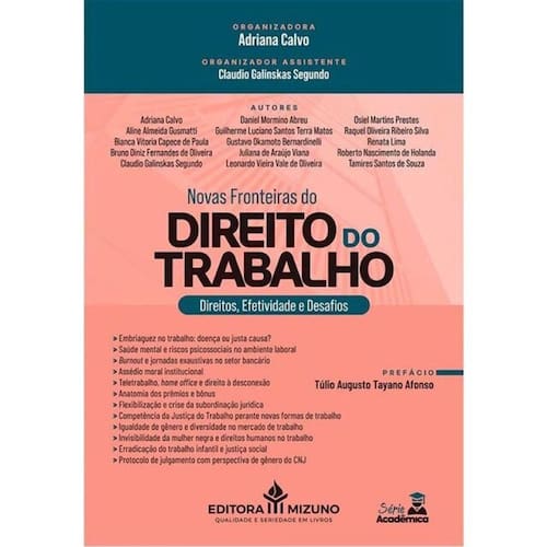 Em um cenário de rápidas transformações tecnológicas e profundas mudanças sociais, o Direito do Trabalho enfrenta o desafio de repensar seus fundamentos à luz das novas formas de produção, das demandas por inclusão e da valorização da dignidade humana. A obra “Novas Fronteiras do Direito do Trabalho” reúne artigos produzidos por alunos da Pós-Graduação em Direito do Trabalho da Universidade Presbiteriana Mackenzie (Turma 2024), sob organização e revisão da professora desta renomada instituição Adriana Calvo e sob a assistência de organização do aluno Claudio Galinskas Segundo. O livro convida o leitor a refletir sobre temas que marcam a contemporaneidade jurídica, tais como a embriaguez como causa de dispensa ou doença ocupacional, passando pelo estudo da síndrome de Burnout, da saúde mental e dos riscos psicossociais, até as discussões sobre teletrabalho, direito à desconexão, crise da subordinação e competência da Justiça do Trabalho perante novas formas de trabalho. Esta coletânea traduz a tensão entre tradição e inovação no mundo do trabalho. Os textos também abordam o papel do Direito do Trabalho na da igualdade de gênero e racial, na proteção da infância e na implementação de protocolos de julgamento com perspectiva de gênero para os magistrados, reafirmando o papel do Direito do Trabalho e da própria Justiça do Trabalho em um tempo de incertezas, mas também de esperanças e reconstruções.