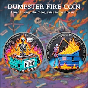 A moeda de lixo de fogo simboliza resiliência e força. Os fogos de lixeira da vida — aqueles momentos em que tudo desmorona — são inevitáveis. Em vez de surtar, esta moeda lembra você de rir através da loucura. Quando as coisas saem do caminho, um bom senso de humor e um pouco de coragem ajudarão você a superar. Se você está enterrado na papelada ou lidando com o caos diário da vida, esta moeda engraçada diz: fique fresco, sorria com a loucura e continue avançando.