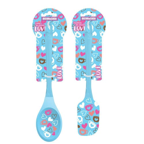 Lindo conjunto para você sua cozinha. O amor é o comanda nossas vidas Composto de: 1 espátula com parte de mexer de silicone 1 colher com parte de mexer de silicone Tamanho: Colher 26cm, 5,7cm x1,8cm Espátula 25cm x 5cm x 1cm Cabo de acricilico da memas cor dos itens. Marca: Não Informado