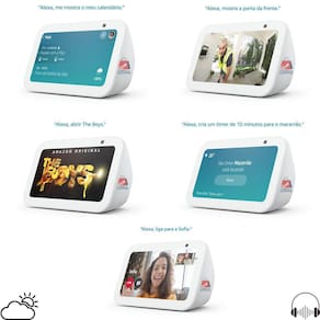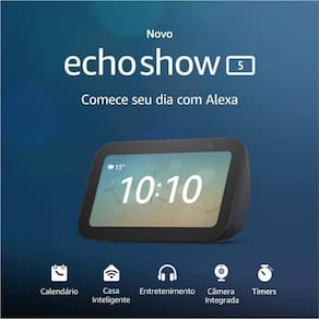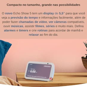 Novo echo show 5 3 geração - 2023 com graves mais potente Cor: preto Voltagem: 110v/220v Echo show 5 3 geração Faça mais com alexa - use sua voz para criar alarmes e timers, dormir profundamente ao som de uma playlist relaxante, começar seu dia com uma rotina de casa inteligente, ver seu calendário e saber a previsão do tempo. Tamanho compacto, som mais potente - assista a filmes e séries, e ouça músicas, podcasts e muito mais no amazon music, spotify, prime video e outros. Tudo isso com um som grave mais potente e vocais mais nítidos. Com o display de 5,5 você pode ver vídeos, filmes, séries, nomes das músicas e muito mais. Mais conforto em sua casa - controle dispositivos de casa inteligente compatíveis, como lâmpadas, interruptores e plugues, mesmo quando você não estiver em casa. Veja mais com a câmera integrada - use a câmera integrada para ver seus familiares, pets e muito mais. Faça uma chamada por drop in para sua casa quando você sair ou veja a porta da frente pelo seu echo show 5 usando câmeras compatíveis. Mantenha contato com vídeo chamadas - use a câmera de 2 mp para fazer chamadas para seus amigos e familiares que tenham o aplicativo alexa ou um dispositivo echo com câmera. Envie avisos para outros dispositivos compatíveis da sua casa. Desenvolvido para proteger a sua privacidade - a amazon não vende informações pessoais de clientes. Este dispositivo foi construído com várias camadas de controles de privacidade, incluindo o botão de desligar o microfone/câmera e uma tampa para câmera integrada. Desenvolvido para a sustentabilidade - este dispositivo foi feito com 100% de fios de poliéster reciclados pós-consumo e alumínio 100% reciclado. A embalagem do dispositivo é 99% reciclável. Queremos que você saiba