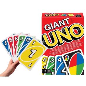 É o jogo de combinar cartas que você conhece, agora três vezes maior. Ótimo para a praia ou piscina Os jogadores ainda correm para se livrar de todas as cartas, combinando uma carta na mão com a carta de cima na pilha de descarte. Quando você tiver apenas uma carta na mão, não esqueça de gritar UNO como um gigante.