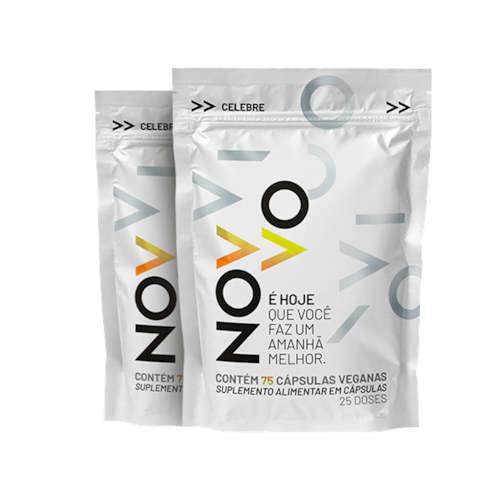 A Bag da Novvo consiste em uma única embalagem que contém zip lock com 25 doses (75 cápsulas) do Novvo Pré-Drink.