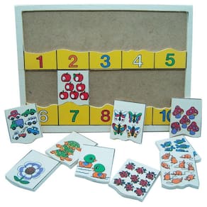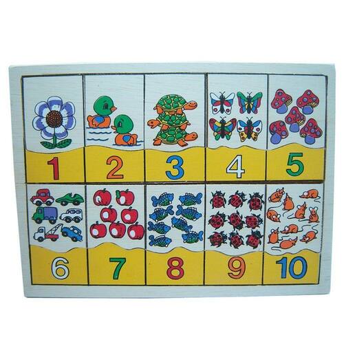 Quebra cabeça em madeira composto por 10 peças, cada peça possui uma quantidade especifica de objeto, fruta, animal etc, e corresponde a sua casa específica marcada com um numeral.