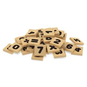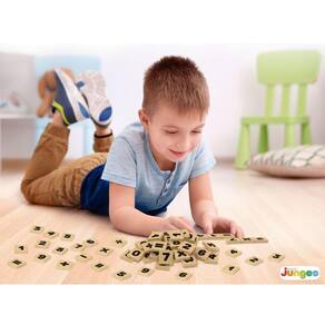 Números da Junges com 40 peças em madeira de reflorestamento (MDF) 6mm, tamanho de 3x3cm impressas em serigrafia, com números e sinais matemáticos (tabuada completa). Ideal para a criança elaborar seus primeiros cálculos!
