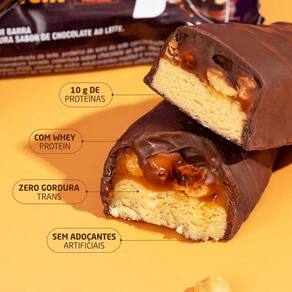 10g de proteínas; Deliciosa cobertura de chocolate; Recheio de caramelo macio e amendoim crocante; Blend de proteínas de alto valor biológico; Com whey protein; 50% menos carboidratos que um chocolate comum; 78% menos açúcar que um chocolate comum; 0 gordura trans; Sem adoçantes artificiais.