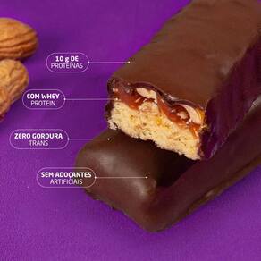 Blend proteico (caseinato de cálcio, proteína concentrada de leite, proteína de soro do leite concentrada, proteína de soro do leite isolada e colageno hidrolisado), recheio de caramelo, amendoim torrado, cobertura sabor chocolate meio amargo, óleo de palma (Elaeis guineenses), polidextrose, pasta de amendoim, frutooligossacarideos (FOS), cloreto de sódio, edulcorantes maltitol e sorbitol, umectante glicerol, antiumectante fosfato tricalcico, emulsificantes goma acácia e lecitina de soja, aromatizantes, conservantes sorbato de potássio e benzoato de sódio e antioxidante DI-alfa-tocoferol. CONTÉM LACTOSE. ALÉRGICOS: CONTÉM AMENDOIM E DERIVADOS DE LEITE E DE SOJA. PODE CONTER AVELÃ. NÃO CONTÉM GLÚTEN.