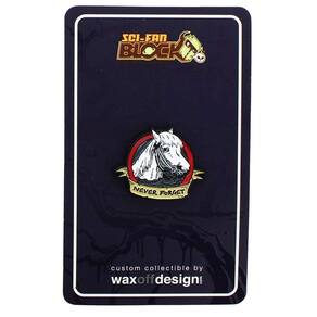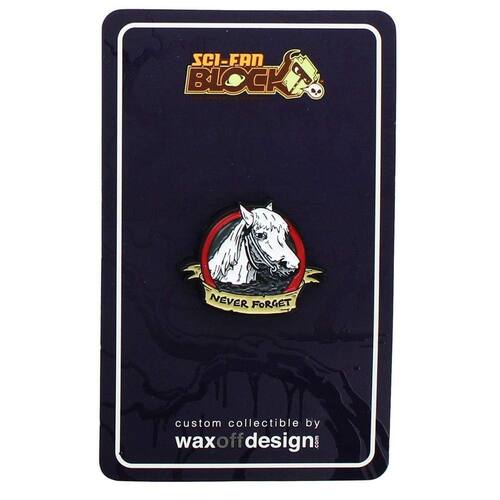 - O broche apresenta o cavalo Artax e o texto "Never Forget".