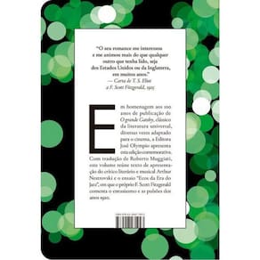 Um dos maiores clássicos da literatura mundial, O grande Gatsby ganha uma edição comemorativa dos 100 anos da publicação com projeto gráfico do premiado designer Mateus Valadares. Inclui textos extras de F. Scott Fitzgerald e do crítico literário e musical Arthur Nestrovski. Em homenagem aos 100 anos de publicação de O grande Gatsby, clássico da literatura universal, diversas vezes adaptado para o cinema, a Editora José Olympio apresenta esta edição comemorativa. Com tradução de Roberto Muggiati, este volume reúne texto de apresentação de Arthur Nestrovski e o ensaio “Ecos da Era do Jazz”, em que o próprio F. Scott Fitzgerald comenta o entusiasmo e as pulsões dos anos 1920. Nessa obra-prima, a misteriosa vida de Jay Gatsby é um retrato glamouroso e fascinante dos Estados Unidos na década de 1920, opulente, extravagante, rápido e feroz. Nick Carraway é o narrador que acompanha de perto os passos de Gatsby e descobre, junto dos leitores, os segredos do amigo, bem como os perigos que o cercam e a paixão que o consome. Uma narrativa elegante e melancólica, que expõe a sombra do sonho americano, a corrupção da riqueza, a fragilidade e superficialidade das relações humanas. Com personagens que já fazem parte do imaginário cultural, como Jay Gatsby, Daisy e Tom Buchanan, o livro já foi adaptado inúmeras vezes para o cinema, tendo a última montagem o ator, ganhador do Oscar, Leonardo di Caprio no papel principal. Um clássico mundial, em uma belíssima edição comemorativa digna de uma festa da Era do Jazz. “Quase um século depois, nós ainda estamos lendo Gatsby” - The New York Times, 2020. “O seu romance me interessou e me animou mais do que qualquer outro que tenha lido, seja dos Estados Unidos ou da Inglaterra, em muitos anos.” - carta de T. S. Eliot a F. Scott Fitzgerald, 1925. “Um livro único, trata-se de uma história mística e glamourosa dos dias atuais.” - The New York Times, 1925. “Scott Fitzgerald é o melhor entre todos” - Times, 1925. “Fitzgerald ainda será assunto quando outros forem esquecidos” - Gertrude Stein.] “O grande Gatsby é, de muitas maneiras, uma espécie de Romeu e Julieta, ainda que seja muito mais que uma história de amor” - The Guardian, 2013.