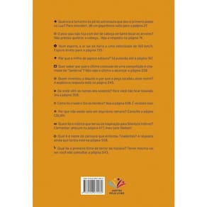 Qual era o tamanho do pé do astronauta que deu o primeiro passo na Lua? Para descobrir, dê um gigantesco salto para a página 27. O pica-pau não fica com dor de cabeça de tanto bicar as árvores? Não precisa quebrar a cabeça... Veja a resposta na página 74. Num espirro, o ar sai do nariz a uma velocidade de 160 km/h. Espirre direto para a página 135. Por que o milho de pipoca estoura? Vá pulando até a página 167. Quer saber por que o último colocado de uma competição é chamado de “lanterna”? Não seja o último a alcançar a página 238. Quem inventou o biquíni e por que a peça recebeu esse nome? A explosiva resposta está na página 245. De onde vêm os nomes dos oceanos? Para você não ficar boiando, leia a página 358. Como foi criado o Dia da Mentira? Veja a página 438. É verdade isso! Por que não existe zero em algarismo romano? Consulte a página CDLXIV. Quem foi o médico que serviu de inspiração para Sherlock Holmes? Elementar: procure na página 477, meu caro Watson! Qual é o nome do carrasco que enforcou Tiradentes? A resposta ainda que tardia está na página 508. Qual foi o primeiro filme de terror da história? Terror mesmo vai ser você não consultar a página 543.