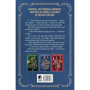 A eletrizante sequência de Jogos de herança Intrigas, reviravoltas, um triângulo amoroso, questões de família e bilhões de dólares em jogo Após as descobertas bombásticas no fim de Jogos de herança, a herdeira Avery Grambs quer juntar as peças e encontrar o homem que pode ter as respostas para todas as suas perguntas —inclusive por que Tobias Hawthorne havia deixado toda a sua fortuna para ela, uma estranha, em vez de para as próprias filhas e netos. As pistas se acumulam, sugerindo uma conexão com a família mais profunda do que Avery jamais havia imaginado. Conforme o mistério aumenta, Grayson e Jameson, os netos enigmáticos e magnéticos de Hawthorne, continuam a puxar a garota em direções diferentes —no jogo e no coração. E Avery agora tem adversários que não vão parar até vê-la fora de cena, custe o que custar. O perigo está à espreita e Avery e os netos de Hawthorne terão que se unir se quiserem descobrir mais sobre o herdeiro perdido e quais pistas ele guarda.
