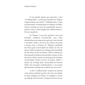 É com grande alegria que apresento a obra "O Influenciador", escrita pelo estimado Pe Wagner Augusto Moraes dos Santos. \"O Influenciador\" é uma reinterpretação contemporânea do diálogo de Platão, Górgias, recriada em torno de inquietações teóricas e práticas sobre a cultura digital dos influenciadores e de seus seguidores. A obra "O Influenciador" poderia ser descrita como esforço mimético positivo do autor em relação às obras dialógicas de Platão. Ao imaginar e recriar um diálogo entre Sócrates e Górgias em torno do que é (ou do que parece ser) um influenciador, formula-se, em verdade, a clássica pergunta sobre a identidade pessoal, sobre o que é ser humano enquanto sujeito capaz de agir e de sofrer em interações mediadas pelo ser digital, virtual. Durante o diálogo, subjaz um sincero convite para que cada influenciador e cada influenciado pergunte-se não só sobre suas vivências, práticas e técnicas no universo digital, mas sobretudo à respeito de sua própria dignidade como \"persona in esse\" e não somente \"homo digitalis in esse apparens\". \"O Influenciador\" também poderia ser compreendido como pertencente ao estilo e à forma de pensar própria de um certo tomismo que, desde o final do séc. XIII até nossos dias, procura conservar o diálogo com os que nos precederam na busca da verdade e, ao mesmo tempo, inovar desde que harmonizando com o que MacIntyre chamou de \"racionalidade da tradição\". Esse aspecto está mais evidente durante a obra a cada vez que o personagem Sócrates é o que refuta o seu interlocutor, indicando-lhe suas contradições. Tal personagem conserva-se naquela autoestima e autorrespeito do ser que se quer e se sabe mais racional do que o outro, sempre julgado por Sócrates como aquele que pensa, diz e vive em aparências opostas ao ser. Sergio Salles Marca: Angelicum Ean: 9786585563024