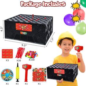 Jogo Whack a Balloon - O pacote inclui: nosso conjunto inclui uma caixa de explosão, um martelo, um inflador de balão, 30 pinos, um spinner e 94 balões. Com todos os componentes essenciais incluídos, você pode aproveitar a hora de brincar sem preocupações com a falta de peças, garantindo uma experiência sem complicações. - Jogo Balloon Whack - Prepare-se para risos e emoções sem fim! Neste jogo selvagem, cada jogador tenta evitar que o balão estoure, enfia pregos na caixa e adivinha quem causou o último boom do balão. - Unforgettable Family Bonding - Nosso jogo Balloon Whack promete risos e diversão para toda a família. Seja jovem ou velho, todos podem se juntar à emoção de adivinhar quem causou o último boom do balão. - Horas de brincadeiras envolventes – os jogos interativos oferecem uma excelente avenida sem tela para promover o desenvolvimento de uma criança. Através da brincadeira, as crianças podem melhorar habilidades como concentração, resolução de problemas e coordenação olho-mão. - Entretenimento versátil – Perfeito para noites de jogos, aniversários, jantares ou férias, o Balloon Whack Game traz emoção para cada reunião. Ele promete uma experiência agradável para todos os participantes.
