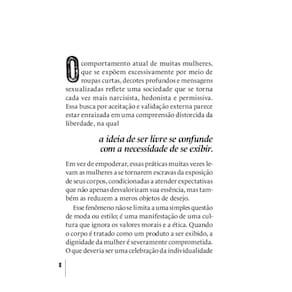 Em uma sociedade que cada vez mais busca aceitação e validação por meio de vestimentas, opiniões e bens materiais, a modéstia cristã é a resposta. A ideia de ser livre se confunde com a necessidade de se exibir, enquanto a verdadeira liberdade se encontra na capacidade de expressar-se de forma autêntica e significativa, longe das amarras de uma cultura que insiste em reduzir as mulheres a meras imagens superficiais. Como, então, ter modéstia e valorizar a feminilidade? Ao adotarmos e promovermos a modéstia, o recato nas vestimentas, não apenas resgatamos a dignidade da mulher, mas também construímos um ambiente que encoraja a prática da virtude. A modéstia não é somente uma questão de roupas, mas também, e principalmente, uma atitude interior que reflete o respeito por Deus, pela própria pessoa e pelos outros. Ao cultivarmos a modéstia em nossas interações e escolhas, contribuímos para uma cultura que valoriza a integridade, a afetividade ordenada, a sexualidade corretamente entendida, a castidade, a autoestima e o respeito mútuo. Marca: Não Informado