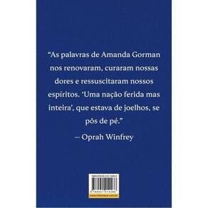Amanda Gorman levou uma mensagem de verdade e esperança a milhões de pessoas e suscitou uma onda de interesse por sua poesia, publicada pela primeira vez no Brasil Em janeiro de 2021, com apenas 22 anos, Amanda Gorman declamou um poema na cerimônia de posse do presidente estadunidense, Joe Biden. O texto, intitulado “O monte que escalamos”, se destinava aos Estados Unidos, mas seu chamado esperançoso sensibilizou o mundo todo. Esta edição especial eterniza o poema e nos oferece coragem, conforto e a inspiração necessária para mudar o mundo. Com prefácio elogioso de Oprah Winfrey, este livro celebra a promessa de um futuro melhor e reafirma o poder da poesia.