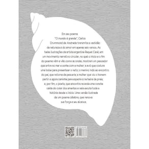 Um belo poema ilustrado sobre o amor e toda sua imensidão — um presente perfeito para casais apaixonados e apaixonados por poesia. Em seu poema “O mundo é grande”, Carlos Drummond de Andrade transmite a vastidão da natureza e do amor em apenas seis versos. As belas ilustrações da artista argentina Raquel Cané, em um movimento narrativo circular, no qual o início e o fim do poema vêm e vão como as ondas, mostram: um pescador que entra no mar e sonha com a mulher; a avó que costura uma bolsa para presentear o neto; o menino indo ao encontro do pai, que retorna da pescaria; a mulher que viu o homem partir e agora caminha para esperá-lo na beira da praia; e, por fim, o poeta, que encontra na areia uma concha caída do colar dos amantes e nela escuta toda a história desde o início. Uma versão ilustrada de um poema célebre, que renova sua força e seu alcance.