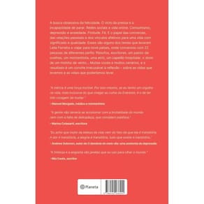 A busca obsessiva da felicidade. O vício da pressa e a incapacidade de parar. Redes sociais e vida online. Consumismo, depressão e ansiedade. Finitude. Fé. E o papel das conversas, das relações pessoais e dos vínculos afetivos para uma vida com significado e qualidade. Esses são alguns dos temas que levaram Leila Ferreira a viajar para nove países, onde conversou com 22 pessoas de diferentes perfis: filósofos, escritores, um pastor de ovelhas, um montanhista, uma atriz, um capelão hospitalar, o dono de um moinho de vento... Muitas vozes e muitos cenários, e o resultado é um convite irrecusável à reflexão – sobre as vidas que levamos e as vidas que poderíamos levar. “A inércia é uma força incrível. Por isso mesmo, se eu tenho um orgulho na vida, mais inclusive do que chegar ao cume do Evereste, é o de ter tido coragem de mudar.” – Manoel Morgado, médico e montanhista “A gente não deveria se acostumar com a brutalidade do mundo nem com a falta de delicadeza, que considero patética.” – Marina Colasanti, escritora “Eu acho que muito da beleza da vida vem do fato de que ela é transitória. A dor é transitória, a alegria é transitória, tudo que existe é transitório.” – Andrew Solomon, autor de O demônio do meio-dia: uma anatomia da depressão “A tristeza e a angústia são janelas que eu uso para olhar o mundo.” – Mia Couto, escritor Marca: Não Informado