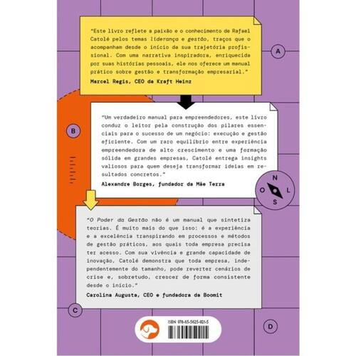 "Ninguém precisa de um investimento exorbitante para implantar uma gestão eficiente". A partir dessa premissa, "O poder da gestão" revela técnicas aprovadas e demonstra que é possível mapear, organizar e implementar um sistema eficaz e duradouro em curto prazo. Da gestão de objetivos à gestão de custos, passando por processos, rotinas, pessoas e vendas, entre outras, Rafael Catolé apresenta as práticas para a construção de um processo forte e consistente, aplicáveis a qualquer tamanho de empresa. São lições valiosas que ele aprendeu e testou ao longo de sua trajetória profissional em empresas de grandes líderes. Agora, ele divide esse conhecimento com o leitor em uma jornada de 100 dias rumo à consolidação de seu negócio.