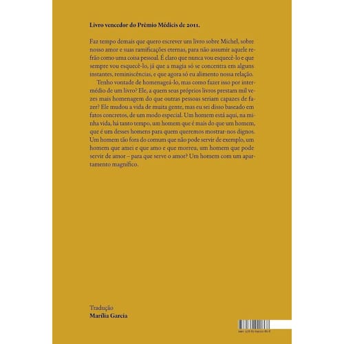 A figura do pai como totem e tabu é temática universal na literatura. No caso de Mathieu Lindon, a sombra do pai teria tudo para ser imobilizadora. Seu pai, Jerôme Lindon, fundador da renomadíssima editora francesa Èditions de Minuit, poderia ser uma barreira perene para toda possibilidade de literatura. Poderia ser o arquétipo da superioridade: do amor que não chega, dos livros inatingíveis. A relação entre Lindon pai e Lindon filho era, afinal e a um só tempo, amorosa e distante, cândida e fria, com o acréscimo de uma espécie de interdito com relação aos autores extraordinários publicados pelo pai. Esta é a história de como esse arquétipo foi superado e ressignificado, por uma outra figura magnética que permeou a vida de Mathieu com a mais fiel das amizades. Michel Foucault foi, para o jovem que era Lindon então, uma espécie de professor sem hierarquia, que lhe emprestava seu famoso apartamento na rua de Vaugirard, que lhe acompanhava em viagens de ácido, que lhe concedia a calidez de uma amizade verdadeira. Que lhe ensinava, sem saber ou intencionar, no ir e vir do afeto entre amigos, o que amar quer dizer: o maestro por acaso de uma educação sentimental. A relação com Michel, que Mathieu Lindon, com sua mão generosa, põe em permanente paralelo com a que tinha com seu pai, matizada pelas vivas descrições da vivência homossexual na sociedade parisiense da época, está aqui descrita com luto, mas também com irreverência, nesta espécie de carta tomada de ternura. Livro vencedor do Prêmio Médicis de 2011.