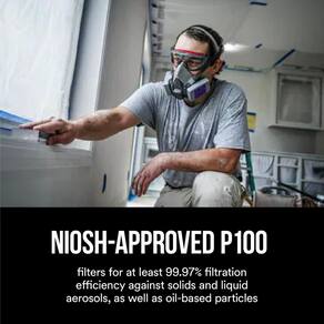 - Filtros P100 aprovados pela NIOSH para pelo menos 99,97% de eficiência de filtragem contra sólidos e aerossóis líquidos, bem como óleos