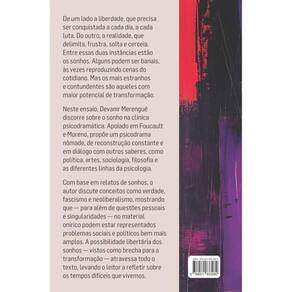 De um lado a liberdade, que precisa ser conquistada a cada dia, a cada luta. Do outro, a realidade, que delimita, frustra, solta e cerceia. Entre essas duas instâncias estão os sonhos. Alguns podem ser banais, às vezes reproduzindo cenas do cotidiano. Mas os mais estranhos e contundentes são aqueles com maior potencial de transformação. Neste ensaio, Devanir Merengué discorre sobre o sonho na clínica psicodramática. Apoiado em Foucault e Moreno, propõe um psicodrama nômade, de reconstrução constante e em diálogo com outros saberes, como política, artes, sociologia, filosofia e as diferentes linhas da psicologia. Com base em relatos de sonhos, o autor discute conceitos como verdade, fascismo e neoliberalismo, mostrando que — para além de questões pessoais e singularidades — no material onírico podem estar representados problemas sociais e políticos bem mais amplos. A possibilidade libertária dos sonhos — vistos como brecha para a transformação — atravessa todo o texto, levando o leitor a refletir sobre os tempos difíceis que vivemos.