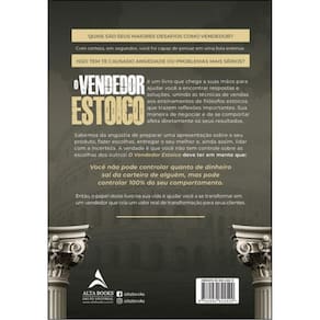 QUAIS SÃO SEUS MAIORES DESAFIOS COMO VENDEDOR? Com certeza, em segundos, você foi capaz de pensar em uma lista extensa. ISSO TEM TE CAUSADO ANSIEDADE OU PROBLEMAS MAIS SÉRIOS? O VENDEDOR ESTOICO é um livro que chega a suas mãos para ajudar você a encontrar respostas e soluções, unindo as técnicas de vendas aos ensinamentos de filósofos estoicos que trazem reflexões importantes. Sua maneira de negociar e de se comportar afeta diretamente os seus resultados. Sabemos da angústia de preparar uma apresentação sobre o seu produto, fazer escolhas, entregar o seu melhor e, ainda assim, lidar com a incerteza. A verdade é que você não tem controle sobre as escolhas dos outros! O Vendedor Estoico deve ter em mente que: Você não pode controlar quanto de dinheiro sai da carteira de alguém, mas pode controlar 100% do seu comportamento. Então, o papel deste livro na sua vida é ajudar você a se transformar em um vendedor que cria um valor real de transformação para seus clientes. VENDAS E ESTOICISMO ESTÃO UNIDOS NESTE LIVRO que tem como objetivo ajudar vendedores e empreendedores a aplicar a filosofia estoica e os conhecimentos propostos por ela à sua vida e aos seus negócios. Vender exige resiliência, coragem e autoconhecimento. É isso que o estoicismo aplicado às vendas será capaz de trazer a quem colocar em prática os ensinamentos e exercícios propostos ao longo dos capítulos. Em O Vendedor Estoico, o leitor aprenderá sobre oratória, técnicas de vendas, neurovendas, além dos ensinamentos de filósofos estoicos importantes, como Sêneca, Marco Aurélio e Epicteto, que refletiram sobre os comportamentos humanos e cujos ensinamentos vêm sendo disseminados por gerações. Até hoje esses ensinamentos fazem sentido e, quando aplicados ao trabalho com vendas, potencializam as práticas de negociação, facilitando o caminho para fechar negócios e prática para lidar com diferentes perfis de clientes e obstáculos que todo vendedor enfrenta.