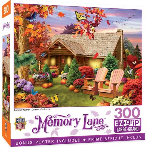 MasterPieces - Quebra-cabeça de 300 peças, formas grandes de aderência EZ, calor de outono, diversão para adultos, idosos, família, crianças, acabamento sem brilho, 45,7 x 61 cm - PEÇAS EXTRA GRANDES: Nossos quebra-cabeças EZ Grip apresentam peças grandes e mais grossas para facilitar a coleta e manipulação; cuidadosamente trabalhados com crianças pequenas e idosos em mente; projetados para serem divertidos e mentalmente estimulantes; ajudam no relaxamento; aumentam as habilidades de resolução de problemas; ótima atividade social com a família e amigos - Formas exclusivas: o quebra-cabeça possui 300 peças em uma variedade de cortes, garantindo um desafio; peças entrelaçadas se encaixam para um ajuste seguro; acabamento fosco antirreflexo reduz o cansaço visual; um pôster vibrante e colorido está incluído para referência enquanto você o monta - Responsável pelo meio ambiente: nossos quebra-cabeças são feitos de material 100% reciclado e tintas à base de soja não tóxicas - Entretenimento para todos: a coleção MasterPieces oferece a maneira perfeita de manter a diversão noturna do jogo; selecione entre quebra-cabeças para adultos, idosos e crianças; baralhos exclusivos de baralho, jogos de tabuleiro, dominó, kits de artesanato e muito mais