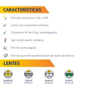 OCULOS ARUBA LENTE CINZA 01.12.2.2 KALIPSOOculos Aruba Af Cinza 01.12.2.2 KalipsoModelo ampla visão, indicado para proteção contra impacto e projeção de partículas volantes. Possui sistema de ventilação indireta, composto de dez fendas na parte superior e oito na parte inferior. A presilha de encaixe do tirante de elástico na lente permite ajuste de ângulo. Maior conforto para utilizar com outros EPIs, como máscaras e protetores auriculares.Composição:Constituído de lentes em policarbonato com armação em plástico rígido e acabamentointerno em borracha maleável.» Sistema de ventilação indireta;» Na tonalidade cinza é aprovado para luz intensa (L2.5);» Resistente a alto impacto (+);» Proteção contra gotas e respingos (D3);» Proteção contra raios ultravioleta (U6).» Embalagem: unidade» CODIGO:74928» MARCA: KALIPSO*IMAGEM MERAMENTE ILUSTRATIVA*