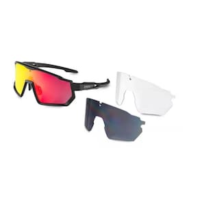 Junto da armação acompanha 3 lentes intercambiáveis para usar conforme sua necessidade, e aproveitando todos os benefícios que cada lente oferece: - Lente transparente é ideal para proteger os olhos à noite ou em ambientes de baixa luminosidade. - Lentes escuras e escuras espelhadas Black Red são ideais para uso durante o dia.