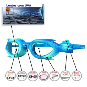Os Óculos De Natação Gold Sports Little Fashion Fish High Definition 7,0 1. Foram projetado para proteger a saúde dos olhos: Estes óculos de natação são projetados especialmente para crianças que gostam de explorar o mundo com segurança debaixo d'água. Eles protegem a saúde ocular do cloro e água salgada frame em silicone gel ultra confort anti alérgico com excelente vedação. 2. Nossos Óculos de natação são projetados para tem um encaixe perfeito na cavidade ocular da criança, com frame em silicone gel ultra que impede a entrada de água. Eles não são apertados, mas confortáveis de usar 3. Tiras duplas livremente ajustável : A tira pode facilmente ser ajustada para caber e ajustar aperto da cabeça ba cabeça da criança, fazendo os óculos confortáveis e seguros. 4. Lentes clara :Óculos de natação, você pode desfrutar do mundo subaquático de relance. As lentes anti-embaciamento HD evitam que o vapor de água afete a sua visão, dando-lhe uma visão clara e transparente do cenário aquático. Suas lentes são em poli carbonato de ultima geração, com camada de proteção UVA e UVB e anti embaçante 5.Conforto: Feito de silicone macio e durável, os Óculos de natação não arranham a pele do rosto ou causam irritação. Eles também são fáceis de limpar. - Materiais: Silicone/poli carbonato - Características do produto: Tira ajustável lentes anti-fog em poli carbonato de alta definição possui camada protetora UVA UVB - Tamanho do produto: sobre 15cm/5.91in de comprimento - Marca: Gold Sports - Garantia: 30 dias após sua compra somente contra defeito de fabricação