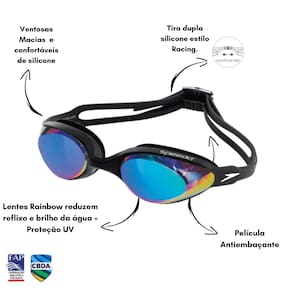 Óculos De Natação Speedo Hydrovision Mr Endurance Obtenha um excelente desempenho no seu treinamento usando o óculos de natação Hydrovision MR Endurance da Speedo. Com lentes espelhadas Rainbow que diminuem o reflexo e brilho nos olhos, proteção UV e tratamento antiembaçante (anti-fog). Projetado com tecnologia "soft frame" que integra ventosa, moldura e narizeira, proporciona excepcional conforto, perfeito para sessões de endurance e segurança nas competições outdoor ( águas abertas, maratonas aquáticas e triahtlon ). Tira repartida de silicone perfeita para atletas iniciantes e amadores pela facilidade de ajuste evisão panorâmica de 180 graus de amplitude do campo de visão.Indicado para nadadores frequentes em distâncias prolongadas, que buscam conforto e tecnologia aliados à durabilidade. Área de vedação tamanho M - ocorre abaixo das sobrancelhas com média cobertura facial.INDICADO PARA USO ADULTO E CRIANÇAS ACIMA DE 8 ANOS DE IDADECaracteristicas:Lentes: 100% policarbonatocom tratamento anti-embaçante e proteção contra raios ultra-violeta e espelhada.Moldura: 100% siliconeVentosas: 100% siliconePresilhas: 100% policarbonatoAprovado pela FAP ( Federação Aquática Paulista ) e CBDATiras: 100% siliconeProduto importadoGarantia contra defeito de fabricação Ean: 7899826786143