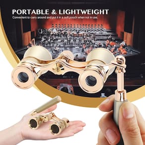 Características: Óculos de ópera elegantes e modernos Ampliação: 3x Diâmetro da lente objetiva (abertura): 25 mm Distância interpupilar (IPD): 58-70 mm Modo de foco: foco central Peso líquido: 0,38 libras (aprox.) Peso da embalagem: 0,46 libras (aprox.) Pacote incluído: 1 x binóculo, 1 x pano de limpeza, 1 x Soft Pounch