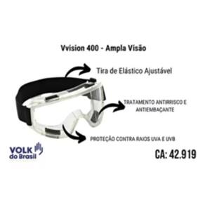 Óculos de segurança modelo ampla visão constituído de armação confeccionada em uma única peça de PVC flexível transparente com sistema de ventilação indireta composto por quatro válvulas, sendo duas na parte superior e duas na parte inferior da armação, visor de policarbonato incolor, tirante elástico para ajuste. O modelo cobre toda a região em torno dos olhos do usuário. Especificações CA: 42919 Tamanhos: Único Cor Lente: Incolor Tratamento da lente: Antirrisco e Antiembaçante Aplicações Testado e aprovado para a proteção dos olhos do usuário contra impactos de partículas volantes, contra raios ultravioleta (U6) e proteção contra respingos de líquidos (D3). Potenciais Clientes Metal Mecânica, Eletroeletrônica ,Petroleira, Química, Frigoríficos, Indústria Alimentícia, Food Service, Varejo Alimentício, Construção civil, Coleta de Lixo, Agricultura, Madeireira, Mineração, Limpeza Profissional entre outros.