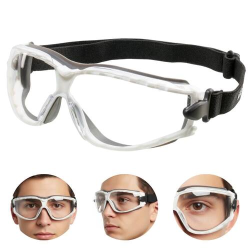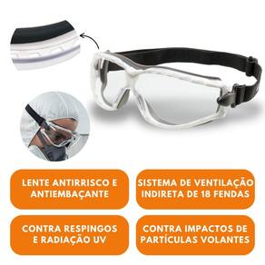 Óculos de proteção, modelo ampla-visão, constituído de armação confeccionada em uma única peça de plástico rígido na cor branca recoberta internamente com borracha, termoplástica macia cinza, sistema de ventilação indireta composto de dezoito fendas, sendo dez na parte superior e oito na parte inferior da armação, ajuste através de tirante elástico preto.
