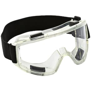 Óculos de segurança modelo ampla visão constituído de armação confeccionada em uma única peça de PVC flexível transparente com sistema de ventilação indireta composto por quatro válvulas, sendo duas na parte superior e duas na parte inferior da armação, visor de policarbonato incolor, tirante elástico para ajuste. O modelo cobre toda a região em torno dos olhos do usuário.