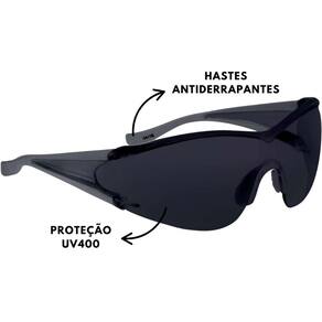 Óculos de proteção monobloco com amplo campo de proteção e proteções laterais, compatibilidade com protetores auriculares.
