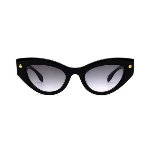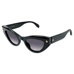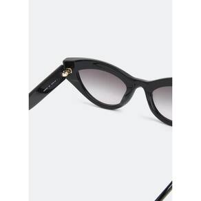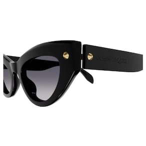 Óculos de sol em acetato preto brilhante com lentes cinza degradê. Os óculos de sol têm formato de olho de gato e são detalhados com duas tachas de metal dourado claro na frente e nas hastes. Finalizado com uma assinatura tonal de Alexander McQueen gravada a laser. Proteção UV 400; Dobradiça óptica de alta qualidade; em acetato; Lentes em nylon resistentes a arranhões; Incluí pano de limpeza e estojo rígido. Medidas: Frontal: 140mm x 52 mm Haste: Acetato Modelo: Cat Cor da lente: Cinza degradê : Preto Marca: Não Informado