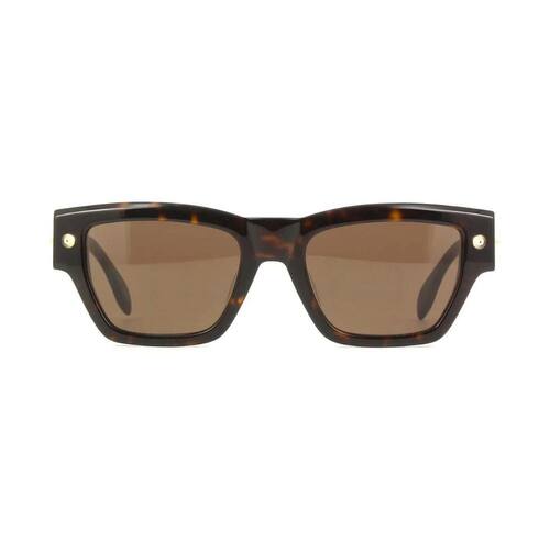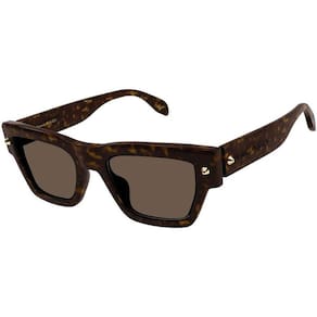 Fazendo referência ao legado punk característico de Alexander McQueen, Stud Structure incorpora a liberdade de expressão e o espírito rebelde da marca. Design retangular e acetato mais robusto. O logotipo Alexander McQueen está gravado a laser nas hastes. A paleta de cores inclui combinações de cores unissex com lentes gradientes e sólidas. Os tachas metálicas são destaques na frente e na lateral. Proteção UV 400; Dobradiça óptica de alta qualidade; em accetato; Lentes em nylon resistentes a arranhões; Incluí pano de limpeza e estojo rígido. Medidas: Frontal: 145mm x 53 mm Haste: Acetato Modelo: Retangular Cor da lente: Marrom : Tortoise / Havana Marca: Não Informado