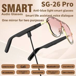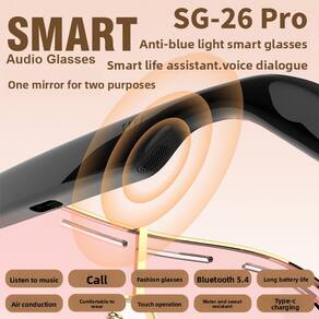 Material: liga metálica+PC Cor: ouro/preto Tamanho da embalagem: 17 × 7 × 6 cm Peso da embalagem: 0,16 kg Lista de embalagem: 1 x óculos de áudio Bluetooth inteligentes SG-26PRO1. Conexão estável Bluetooth 5.4: alimentados pela avançada tecnologia Bluetooth 5.4, esses óculos de áudio inteligentes fornecem emparelhamento rápido e conectividade sem fio estável em até 15 metros para chamadas e músicas perfeitas. 2. Áudio de condução aérea HiFi: com tecnologia de condução de ar, o SG-26PRO oferece som estéreo de alta definição, mantendo seus ouvidos abertos para a conscientização ambiental e a segurança diária. 3. 8 horas de reprodução e carregamento tipo C: desfrute de até 8 horas de conversa ou reprodução de música com uma única carga. O carregamento conveniente do tipo C garante um reabastecimento de energia rápido e eficiente. 4. Lentes de proteção UV: lentes de qualidade óptica oferecem proteção UV confiável, ajudando a proteger seus olhos da luz solar nociva, mantendo uma visão clara e confortável ao ar livre. 5. Controle de toque e design durável: a operação intuitiva de toque permite fácil controle de músicas, chamadas e assistentes de voz. A estrutura de liga metálica com hastes de PC garante durabilidade, conforto leve e estilo moderno.