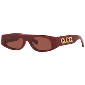 Os óculos de sol GG1771S 003 da Gucci, retangular destaca uma de acetato bold, as lentes marrom. Leva a escrita GUCCI em metal dourado que decora as hastes e eleva o design com um aceno à Maison. Proteção 100% UVA/UVB; Lente de policarbonato, resistente a arranhões; Dobradiça óptica de alta qualidade; em metal; Incluí pano de limpeza e estojo rígido. Medidas: Tamanho: 51 x 16 Haste: 140mm Cor da lente: Marrom Cor da : Bordo Marca: Não Informado