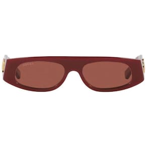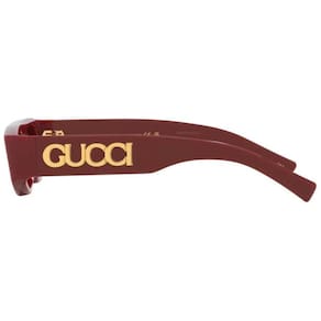 Os óculos de sol GG1771S 003 da Gucci, retangular destaca uma de acetato bold, as lentes marrom. Leva a escrita GUCCI em metal dourado que decora as hastes e eleva o design com um aceno à Maison. Proteção 100% UVA/UVB; Lente de policarbonato, resistente a arranhões; Dobradiça óptica de alta qualidade; em metal; Incluí pano de limpeza e estojo rígido. Medidas: Tamanho: 51 x 16 Haste: 140mm Cor da lente: Marrom Cor da : Bordo Marca: Não Informado